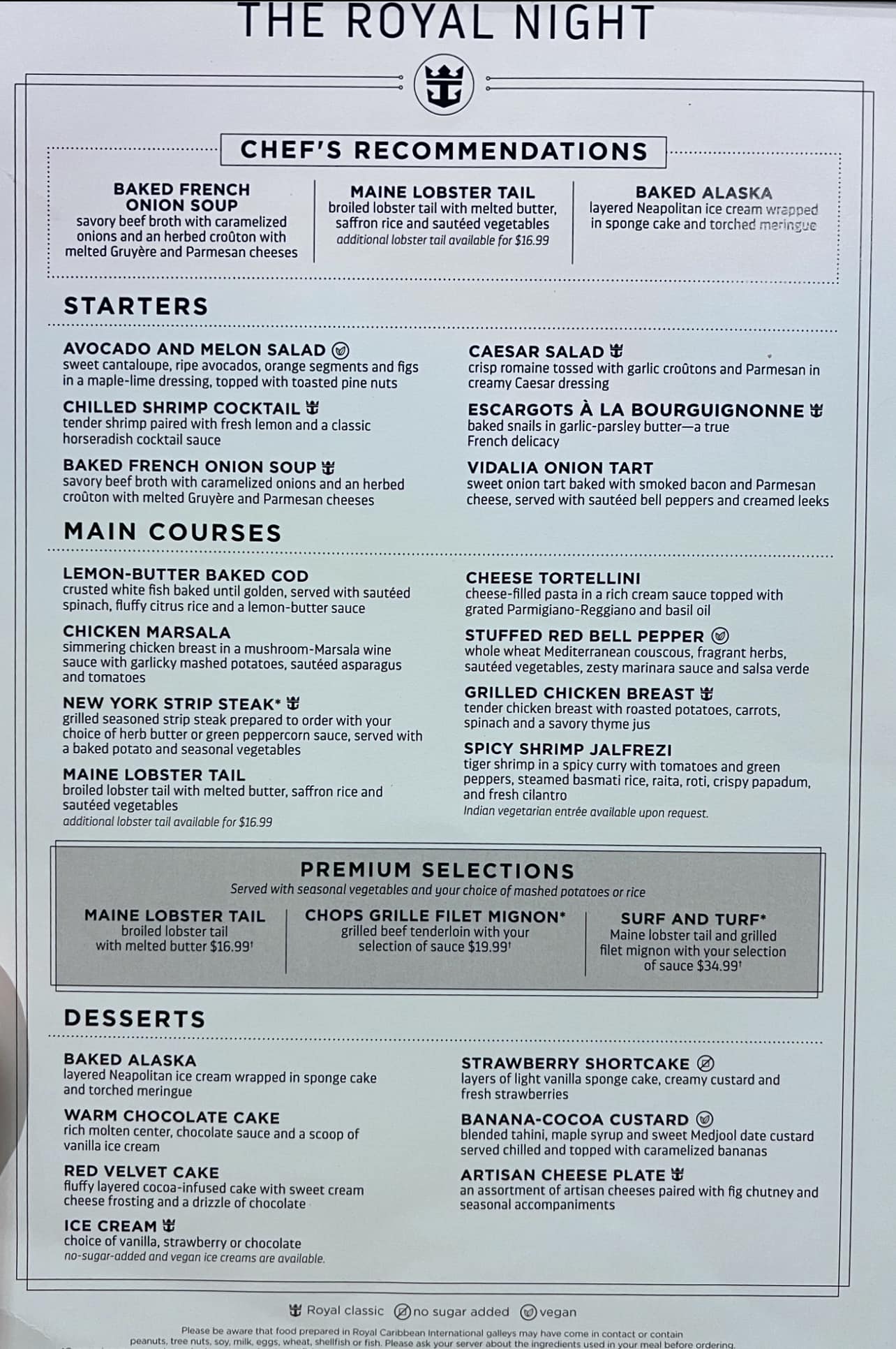 Adventure of the Seas Main Dining Room Menus 2024